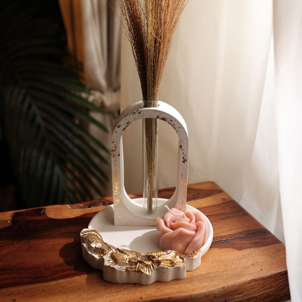 Introducing Bouquet, the elegant set featuring a uniquely embossed tray, arch vase, and flower candle. The perfect addition to any home, experience the beauty and charm of our thoughtful design.