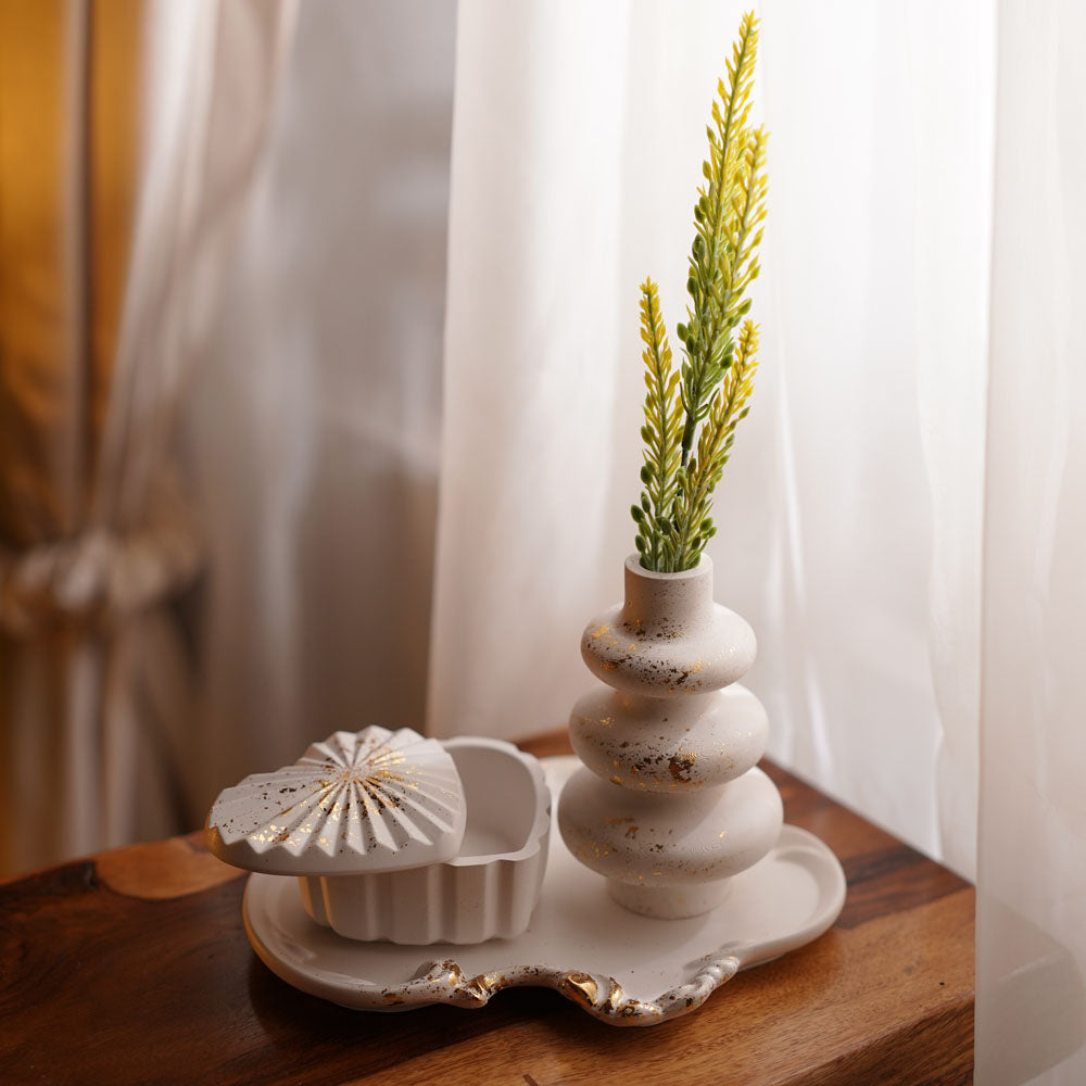 This set includes a vintage style tray, perfect for displaying your favorite trinkets. The 3 tier mini vase adds a touch of charm to any room, while the heart shaped trinket box keeps your treasures safe. Upgrade your home space with this elegant set.