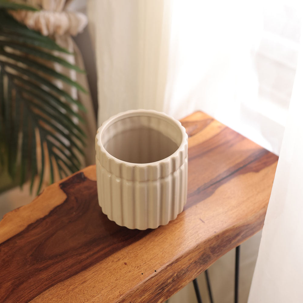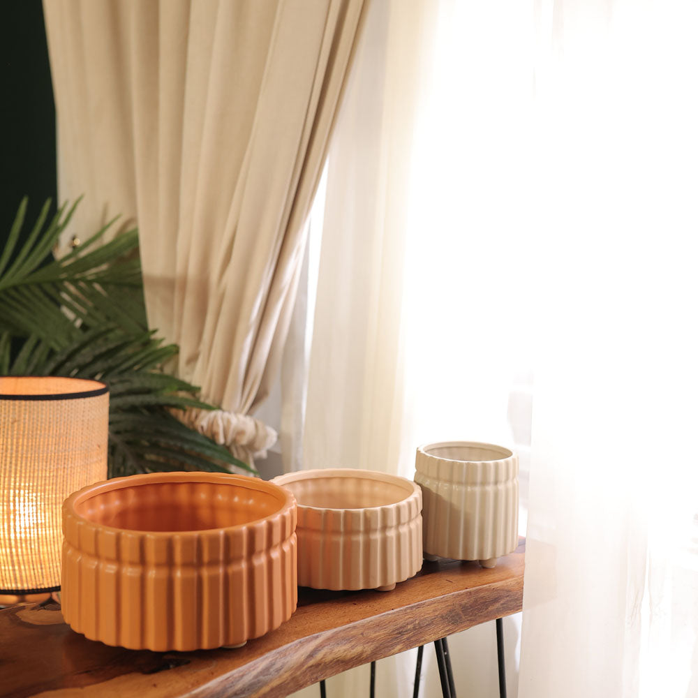 Experience the beauty of these handcrafted ribbed ceramic pots. Add a touch of sophistication to your space with these exclusive pots. Elevate your plant game with these elegant vessels, perfect for any modern home.