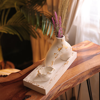 This decoration set is a harmonious combination of form and function, curated to elevate the ambiance of your living space. The rectangular tray serves as the foundation of the set, characterized by its clean lines and modern design.