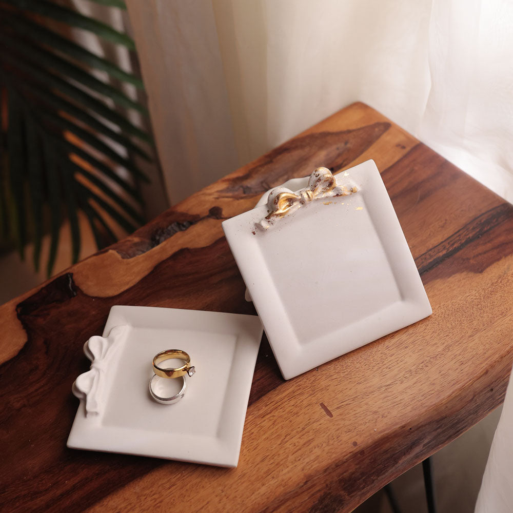 This sleek and stylish tray keeps your small items organized and accessible, adding convenience to your daily life. Whether you use it for jewelry, keys, or other necessities, this square-shaped tray with a beautiful bow accent will make your space feel both functional and elegant.
