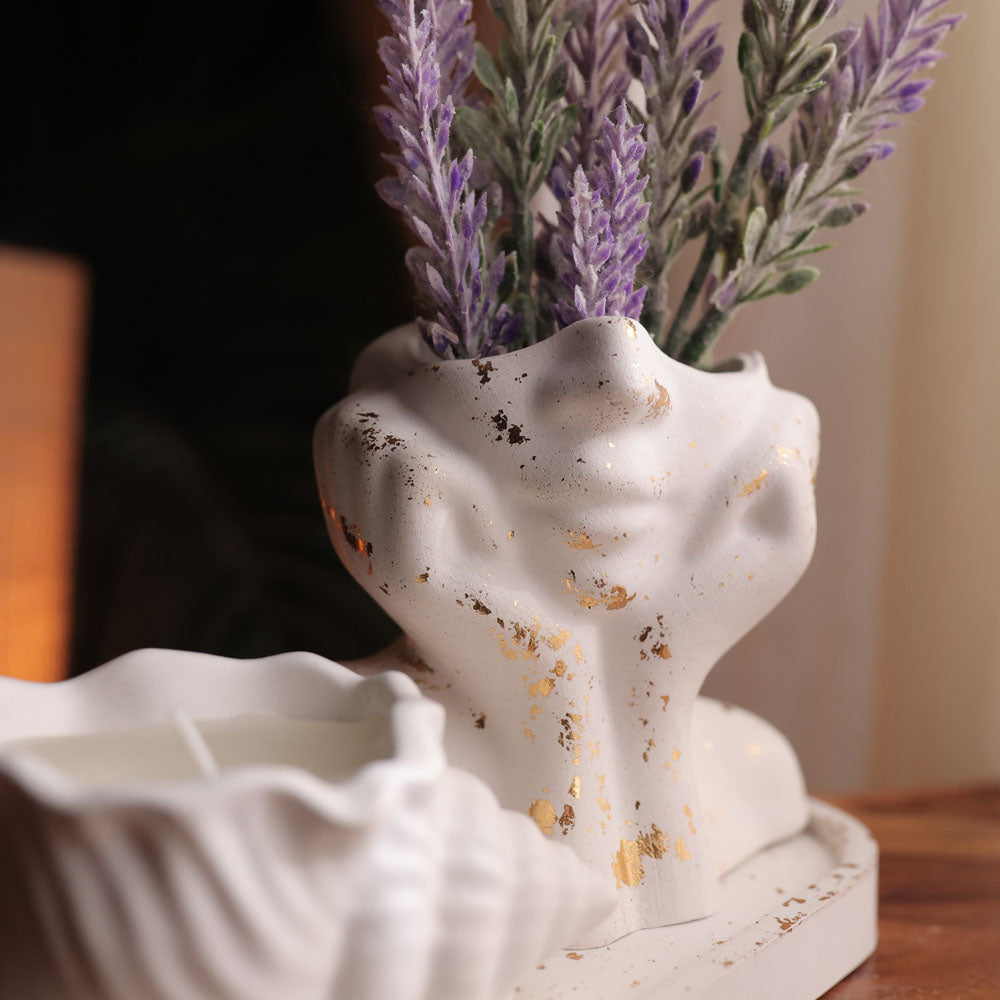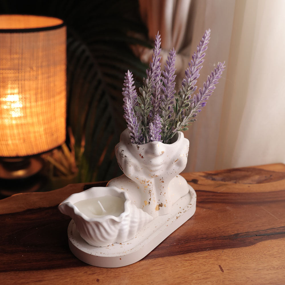 Create an enchanting atmosphere in any room with the Tinsel Set. Featuring a trinket oval tray adorned with a delicate lady face pot and coonch-shaped candle, this set adds a touch of elegance and charm. Perfect for gifting or adding a decorative accent to your home.